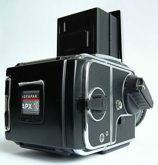 Mit der kleinen Kurbel am Magazin wird der Film beim Einlegen zur ersten Aufnahme transportiert und am Ende komplett umgespult.