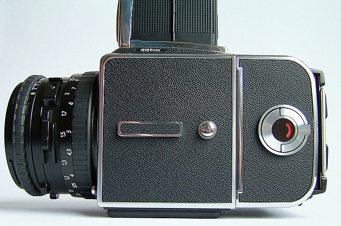 In den Schlitz zwischen Gehäuse und Magazin kann der Metallschieber eingeschoben werden. Damit kann ein Magazin jederzeit mit eingelegtem Film abgenommen werden (bei APS hieß das "Mid-Roll-Change" bei Mittelformat sind es "Wechselmagazine" :-)