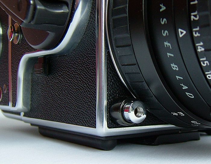 Links dahinter ist der Auslöser für die Spiegelvorauslösung zu sehen. Rechts am Objektiv die EV-Skala.