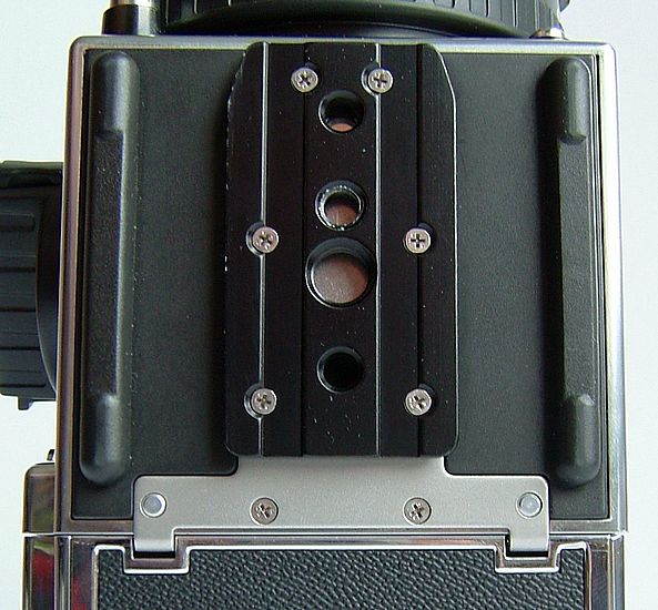 Die Bodenplatte hat je ein Innengewinde für 1/4" und 3/8" Stativgewinde. Sie ist außerdem als Schwalbenschwanz ausgeführt; somit kann die Kamera ohne weitere Schnellwechsel-Platten an spezielle Stativadapter angesetzt werden.