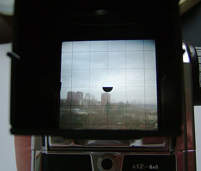 Die Qualität des Sucherbildes ist viel besser als man das hier mit einem Digitalfoto wiedergeben kann. Auch das Schnittbild ist bei einem 2,8er-Objektiv natürlich ohne Abschattung zu sehen. Aber so ähnlich sieht es eben aus, wenn man von oben auf die Kamera schaut.