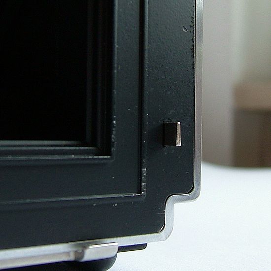 Wenn man den Auslöser drückt, kommt hinten am Gehäuse dieser Stift heraus. Dieser passt in eine entsprechende Öffnung am Magazin. Wenn im Magazin der Schieber eingesetzt ist (wenn also auf dem Film gar nichts ankommen würde), dann verdeckt das Magazin diese Öffnung, so dass der Stift nicht einfahren kann. Dadurch ist der Auslöser blockiert, wenn der Schieber eingesetzt ist.