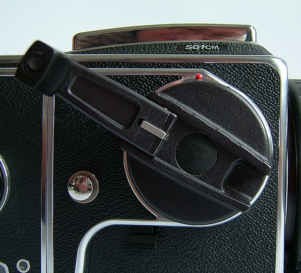 ... ausgeklappt werden und ist dann eine Kurbel. Damit wird der Objektiv-Verschluss gespannt, der Spiegel herunter geklappt und der Film weiter transportiert. Das alles immer in genau einer 360°-Umdrehung.