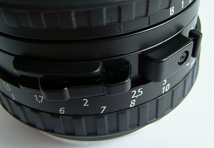 Der Schieber links ist der Abblendhebel (in beiden Stellungen arretierbar), rechts befindet sich der Anschluss für das Blitzkabel (PC-Buchse) mit Klemmung.