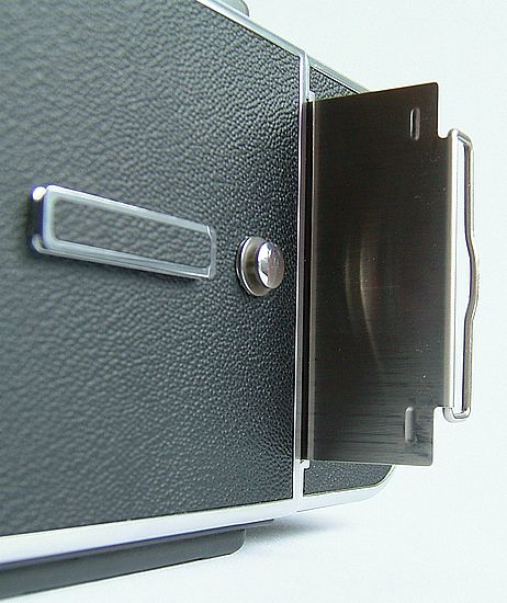 Damit bei abgenommenem Magazin kein Licht auf den eingelegten Film fällt, befindet sich eine Metallplatte, der sog. Magazinschieber vorne im Magazin. Diese ist hier halb herausgezogen abgebildet.