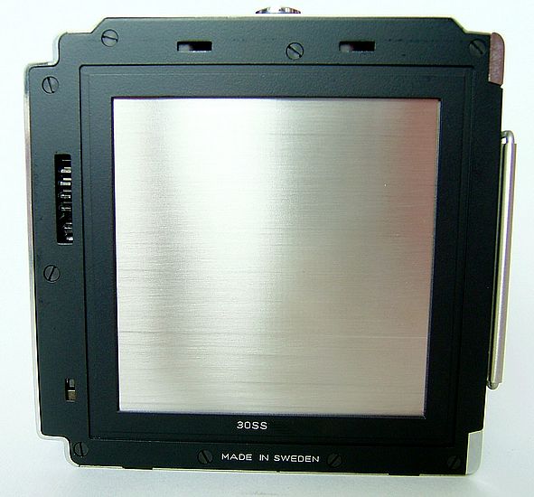 Man schaut direkt auf den metallenen Magazinschieber, der dafür sorgt, dass kein Licht auf den im Magazin befindlichen Film fällt.