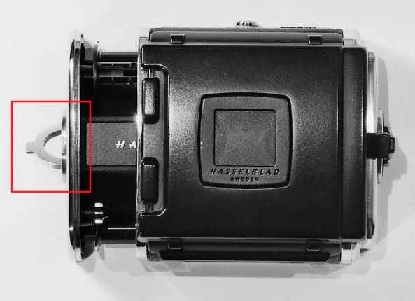 Öffnen Sie das Magazin. Dazu den kleinen Hebel (rot markiert) ausklappen und im Gegenuhrzeigersinn um ca. 45° drehen. Der Film-Einsatz kann dann heraus genommen werden.