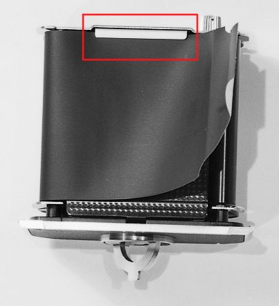 Wenn Sie den Anfangsstreifen des Films über die Andruckplatte hinweg auf die andere Seite zur Leer-Rolle ziehen, achten Sie unbedingt darauf, dass Sie ihn unter der silbrigen Lasche hindurchziehen. Durch Drehen am (sowieso herausgeklappten) Hebel für das Öffnen des Magazins können Sie diese Lasche entriegeln bzw. verriegeln. Dadurch ist das Schutzpapier fixiert und der Film lässt sich leichter in die Leer-Rolle einfädeln. Nächster Schritt |