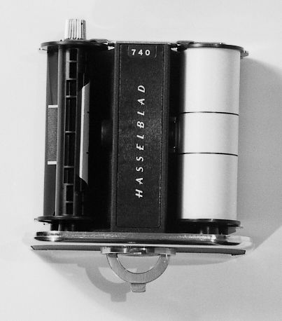 Fädeln Sie den Film wie gezeigt in die Leer-Roll ein. D.h. der Film wird durch den Schlitz in der Leer-Rolle gezogen und durch Drehen am Knopf oberhalb der Rolle aufgewickelt. Lösen Sie dazu die Klemme mit dem halbrunden Hebel. Nächster Schritt |