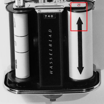 Drehen Sie am Knopf oberhalb der Leer-Spule so lange, bis sich der Pfeil auf dem Schutzpapier und das rote Dreieck über der Filmspule gegenüber stehen. Halten Sie dann die Filmspule an den Außenrändern fest und drehen Sie mit dem Knopf noch etwas, so dass sich der Film auf beiden Spulen gut spannen kann. Nächster Schritt |