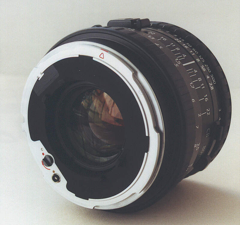 Der Prontor-Verschluss im Objektiv kann mit einer Münze zur Not von Hand aufgezogen werden. Der rote Pfeil zeigt dafür die Drehrichtung an. Der hohle rote Pfeil muss zum Einsetzen des Objektivs in das Bajonett nach oben zeigen.