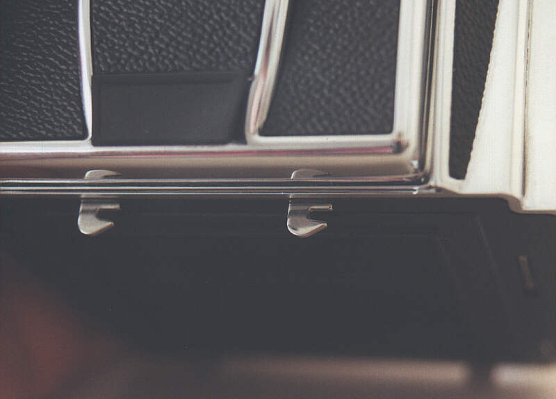 Die Haken auf der Oberseite des Gehäuses zur Fixierung des Magazins. Darüber der geschlossene Lichtschacht. Wenn das Magazin - wie hier - nicht angesetzt ist, kann der Lichtschacht ganz einfach herausgeschoben werden.