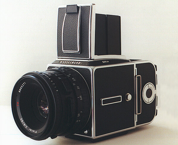 Die Kamera "von der anderen Seite", Lichtschacht geöffnet. Am Gehäuse befinden sich eine Schiene zur Aufnahme von Zubehör sowie ein Knauf für den Trageriemen. Der rechteckige Bügel ist der Griff des Magazin-Schiebers. Dahinter (rund) befindet sich der Öffnungsriegel des Magazins.