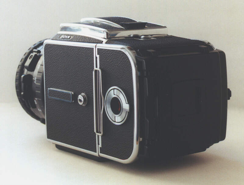 Die 501CM von hinten, Lichtschacht geschlossen. Auf der Rückseite des Magazins befindet sich ein Memo-Halter zum Einschieben des Deckels der Filmschachtel.
