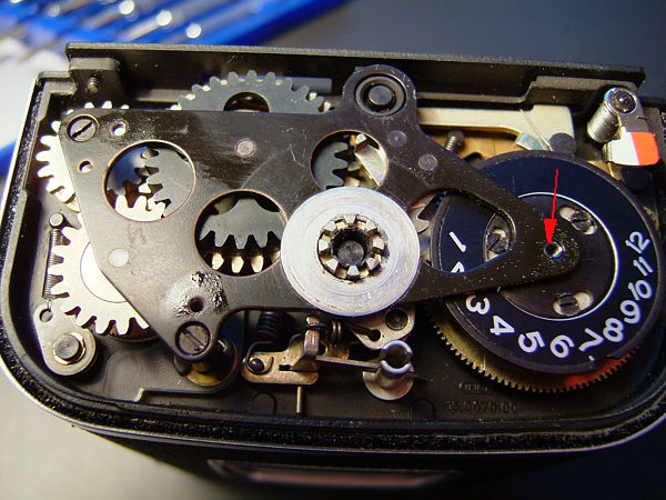 Man sieht hier rechts oben das "Fähnchen", das für den rot/weißen Indikator zuständig ist. Darunter das Rad mit den Bildnummern. Dieses hat bei der "7" eine Kerbe, über die beim Einspulen des Films dann bei der "1" angehalten wird: die "7" wird von der Nase erfasst, die sich auf obigem Bild bei der "1" befindet und in diesem Moment befindet sich dann die "1" im Fenster.