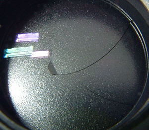 Bei geschlossenem Verschluss sieht man, dass das obere Blatt des Zentralverschlusses einen Knick hat. Dieser ist absichtlich hineingemacht, er sorgt dafür, dass sich die Lamellen beim Schließen des Verschlusses nicht ineinander verhaken.