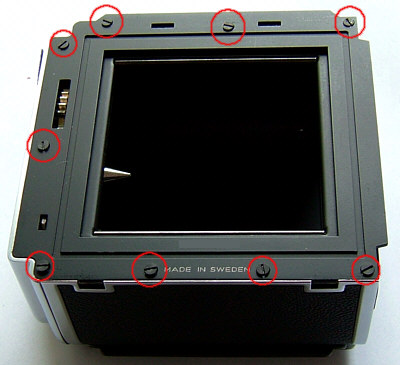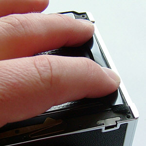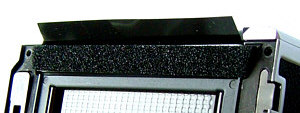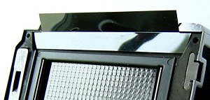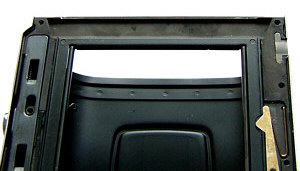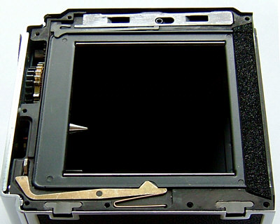 Das Bild rechts zeigt den Blick in das Gehäuse einer Hasselblad 501CM: das Objektiv ist abgenommen, der Hilfsverschluss geöffnet, die Schieberdichtung entfernt, von rechts wird mit einer Taschenlampe durch den Schieberschlitz ins Magazin geleuchtet. Es ist deutlich zu sehen, dass das Licht an der (von hier aus betrachtet) linken Magazinkante reflektiert wird. Dies ist auch die Kante mit den beiden charakteristischen Kerben, die hier gut zu sehen sind.