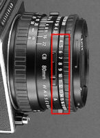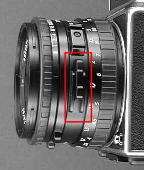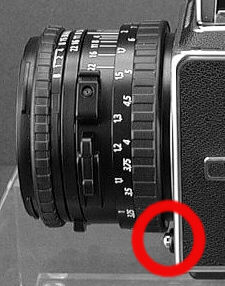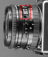 Der kleine Hebel unterhalb des Blitzanschlusses ist die Abblendtaste. In der "herausgefahrenen" Stellung (siehe Bild) wird die Blende erst bei der Belichtung auf den eingestellten Wert geschlossen. Ansonsten wird immer entsprechend abgeblendet und man kann die Wirkung auf die Tiefenschärfe abschätzen.