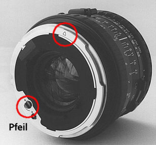 Zum Ansetzen wird die rote Marke am Objektiv dem roten Punkt am Gehäuse gegenüber gestellt, das Objektiv angesetzt und durch eine Drehung nach Links eingerastet. Das Objektiv rastet durch ein leises Klicken ein.