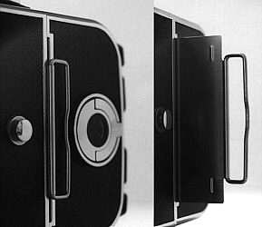 An der Rückseite des Gehäuses befindet sich ein Hilfsverschluss. Dieser öffnet sich nur für die Aufnahme. Er ist erforderlich da der Zentralverschluss im Objektiv geöffnet sein muss, so lange das Sucherbild auf der Mattscheibe betrachtet werden soll (sonst würde ja Licht auf den Film fallen).
