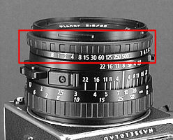 Aus diesem Grund sind die langen Verschlusszeiten (ab 1/4 Sekunde) auf dem Verschlusszeiten-Ring zusätzlich mit einer Markierung versehen.
