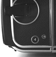 Im Deckel des Faltlichtschachts befindet sich oben ein kleiner Hebel mit einem nach rechts weisenden Pfeil. Den Hebel in Pfeilrichtung schieben. Die Sucherlupe klappt aus. Die Lupe hat eine 4,5-fache Vergrößerung und wird vor allem zum Scharfstellen (Fokussieren) ausgeklappt. Dabei wird die Kamera mit der Lupe direkt vor das Auge gehalten. Die Komposition des Bildes geschieht dann wieder mit eingeklappter Lupe.