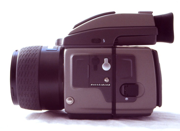 Ansicht von Links. Man sieht den Hebel für den Blitz, die Abdeckung für die PC-Buchse, die Magazin-Entriegelung (silbern), unten links die Bajonett-Entriegelung und am Magazin den Hebel für den Magazinschieber. Am Prisma (oberhalb der Trennlinie zwischen Gehäuse und Magazin) befindet sich der Entriegelungsknopf für das Prisma.