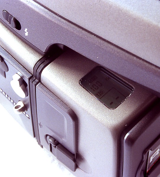 Das Magazin-Display ist bei montiertem Prisma nur schwierig einzusehen. Das ist allerdings auch nicht unbedingt nötig, denn die wichtigsten Informationen wie Filmempfindlichkeit und Bildstand werden auch im Display des Gehäuses angezeigt.