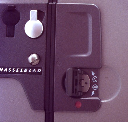 Der Magazinschieber ist ein fest eingebautes Stück Federstahlblech. Es wird mit diesem Hebel geschlossen (Indikatorfenster rot) und geöffnet (Indikatorfenster weiß). Bei geschlossenem Magazinschieber erscheint eine entsprechende Anzeige auf dem Display im Handgriff und im Prisma ("Darkslide is closed").