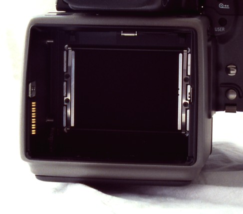 Der Blick von hinten in das geöffnete Magazin. Man sieht sehr schön die beiden eingeschliffenen Dreiecke, die für die charakteristischen "V"-Markierungen bei allen Hasselblad-Fotos sorgen (auch bei der V-Serie).