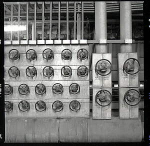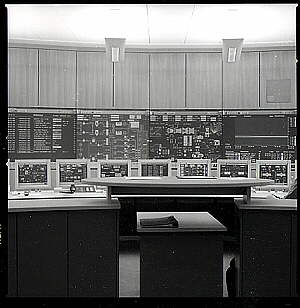 Kontrollraum. Auf dem Negativ kann man sogar den Text auf den "kleinen" Bildschirmen lesen