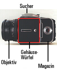 Eine gängige Konstruktion im MF-Bereich ist der von Victor Hasselblad entworfene Würfel. Das Gehäuse hat die Form eines Würfels, an dessen Seitenflächen sich die verschiedenen anderen Funktionen anschließen lassen: