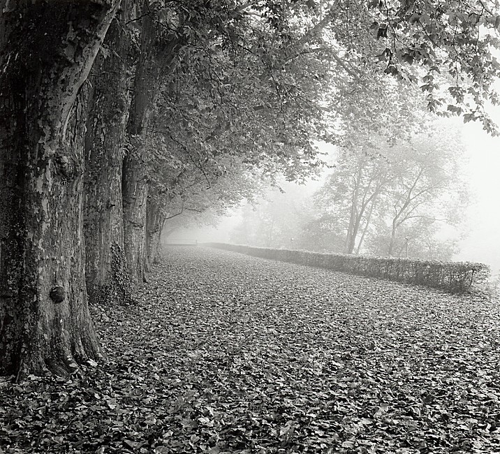 Die der Neckarfront zugewandte Seite der Platanenallee, morgens im Herbstnebel.