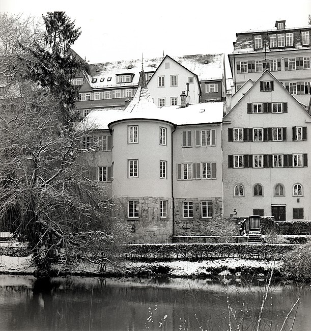 Das Bild hat inzwischen schon historischen Wert, denn die Trauerweide links vom Gebäude ist im Sommer 2003 in den Neckar gefallen. Und das neue Bäumchen hat noch nicht ganz die bildprägende Größe des Vorgängers erreicht ...