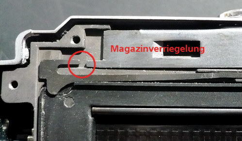 So wird dafür gesorgt, dass sich die Kamera nur auslösen lässt, wenn kein Schieber im Magazin ist.