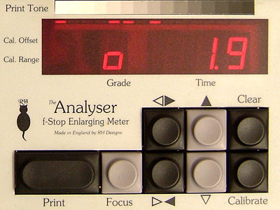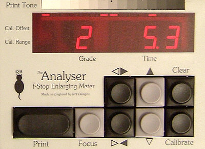 Der Analyser ist eine Mischung aus Zeitschaltuhr und Labormessgerät. Dabei ist er in der Lage, gleichzeitig die Belichtungszeit und die Gradation zu ermitteln. Die im Display auf der linken Seite angezeigte Gradation muss man selbst am Vergrößerer einstellen, die Zeit kann über die Print-Taste beliebig oft abgerufen werden.