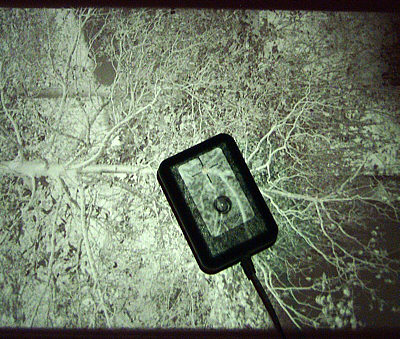 Damit der Messsensor (in dem kleinen Kästchen innerhalb des Fadenkreuzes) nur das vom Vergrößerer kommende Licht misst, wird die Laborleuchte ebenfalls an den Analyser angeschlossen. Während der Messung, aber auch während der eigentlichen Belichtung schaltet der Analyser die Dukaleuchte dann ab.